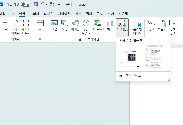 - 삽입 > 스크린숏을 클릭하면 현재 열려 있는 창이 자동으로 표시됩니다.