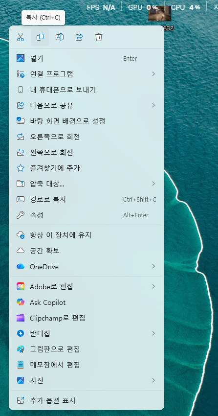 - 그림 파일 또는 웹의 이미지를 마우스 오른쪽 > 복사