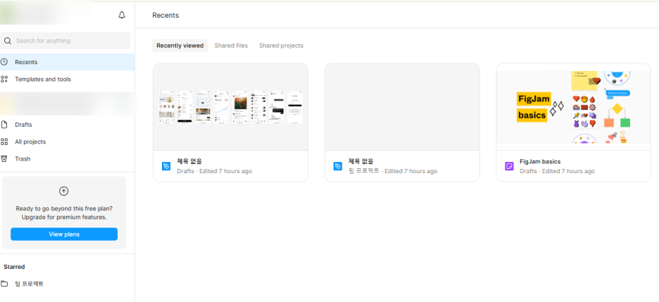 자 그럼 이름을 클릭해서 이름을 변경해 주세요 저는 "Practice Figma1"로 설정했습니다.
