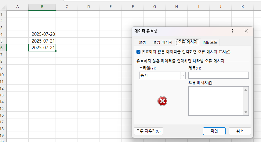 이런 현태로 설정해 두면, 잘못된 값을 입력했을 때 엑셀이 경고창을 띄웁니다.