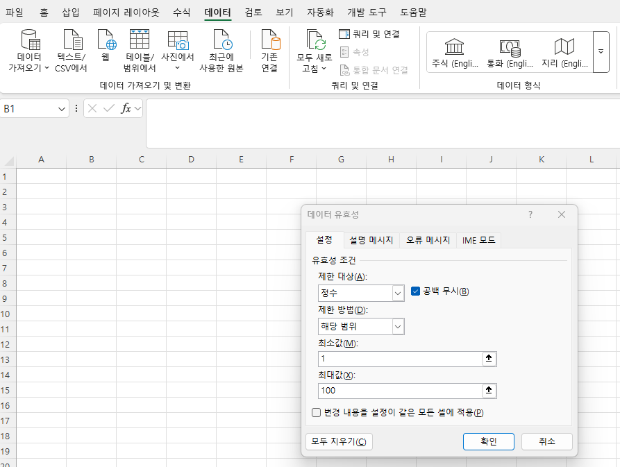 범위를 최솟값 1, 최댓값 100으로 설정한 다음 확인을 누르고 설정한 범위에 101을 입력해 보도록 하겠습니다.