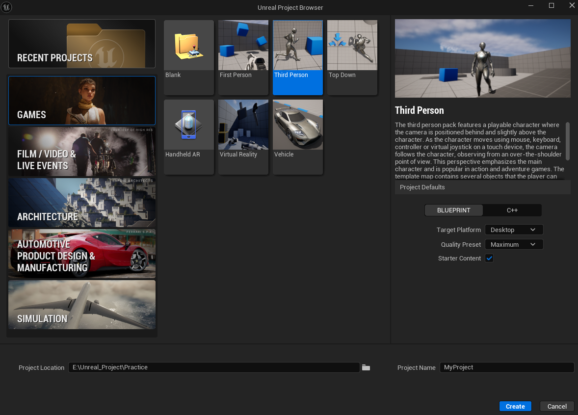 - 언리얼 5 실행 > Games > ThirdPerson을 선택하고 프로젝트 명을 입력해 주세요