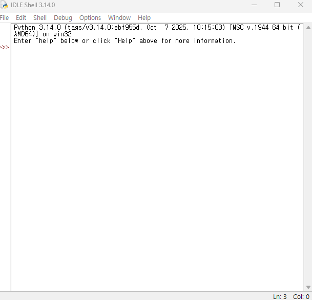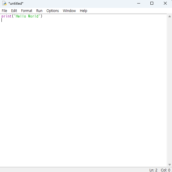 - IDLE 창 상단 메뉴를 보면 File, Edit, Format, Run 등의 메뉴가 보입니다.