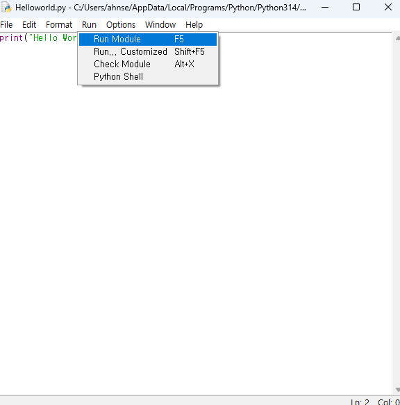 - 상단 메뉴 Run > Run Module을 클릭합니다. (단축키 F5로도 가능합니다.)