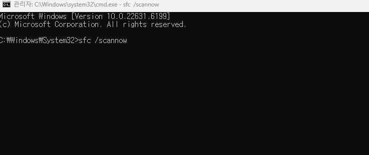 - 명령어: sfc /scannow 복사 후 붙여 넣기